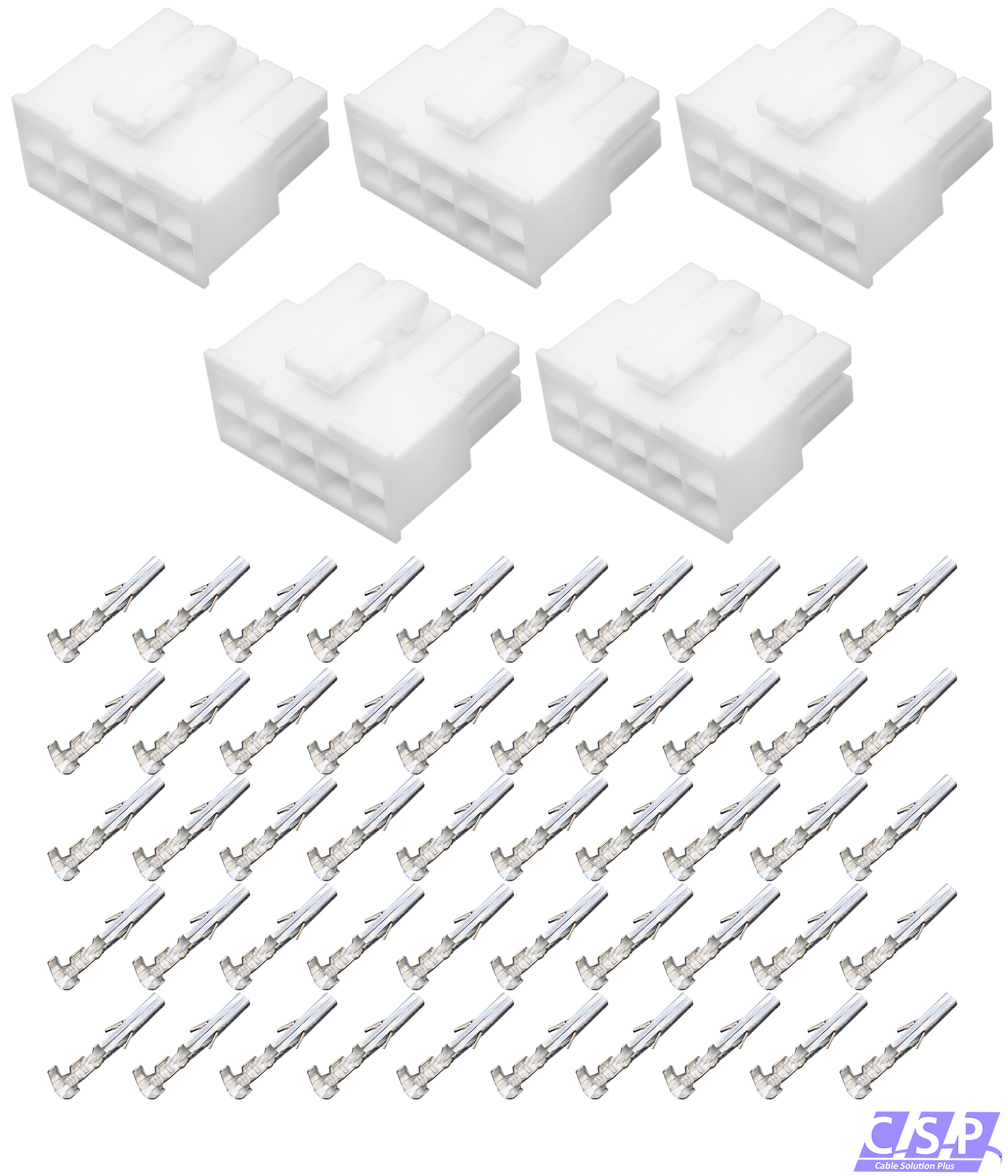 Geliefert werden 5x 10-polige Nuchsengehäuse aus der Serie Molex Mini-Fit Jr. mit passenden Buchsenkontakten für Querschnitt AWG18-24 und Leitung mit einem Außendurchmesser von Ø 1,30-3,10mm