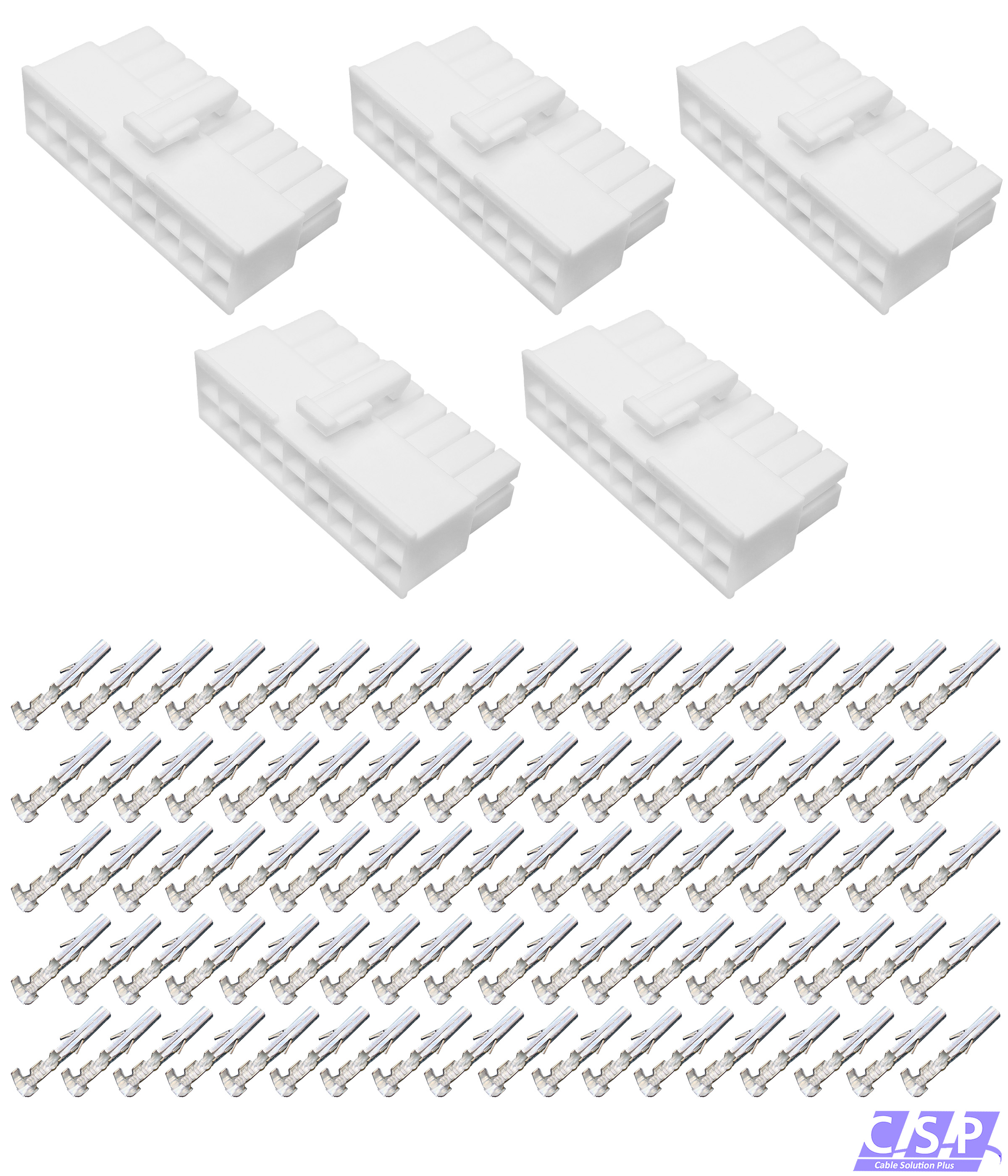 Geliefert werden 5x 18-polige Nuchsengehäuse aus der Serie Molex Mini-Fit Jr. mit passenden Buchsenkontakten für Querschnitt AWG18-24 und Leitung mit einem Außendurchmesser von Ø 1,30-3,10mm