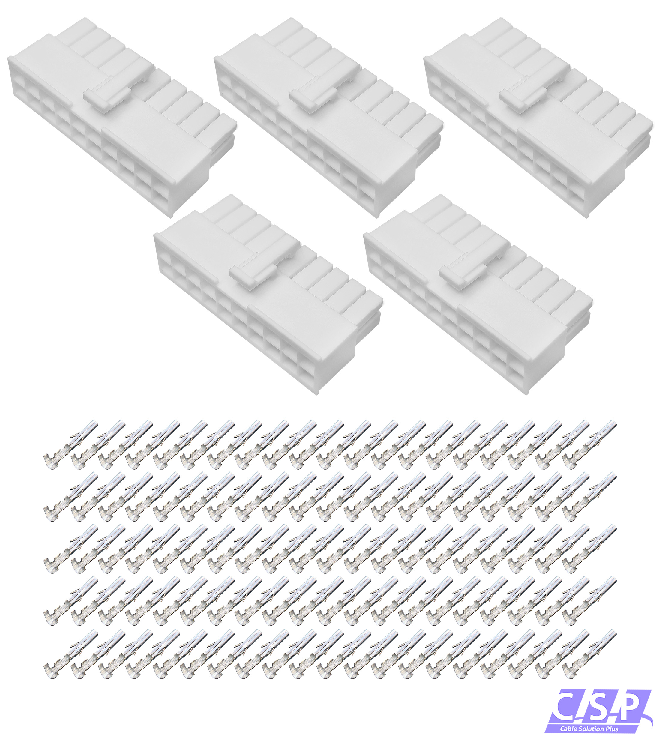 Geliefert werden 5x 20-polige Nuchsengehäuse aus der Serie Molex Mini-Fit Jr. mit passenden Buchsenkontakten für Querschnitt AWG18-24 und Leitung mit einem Außendurchmesser von Ø 1,30-3,10mm