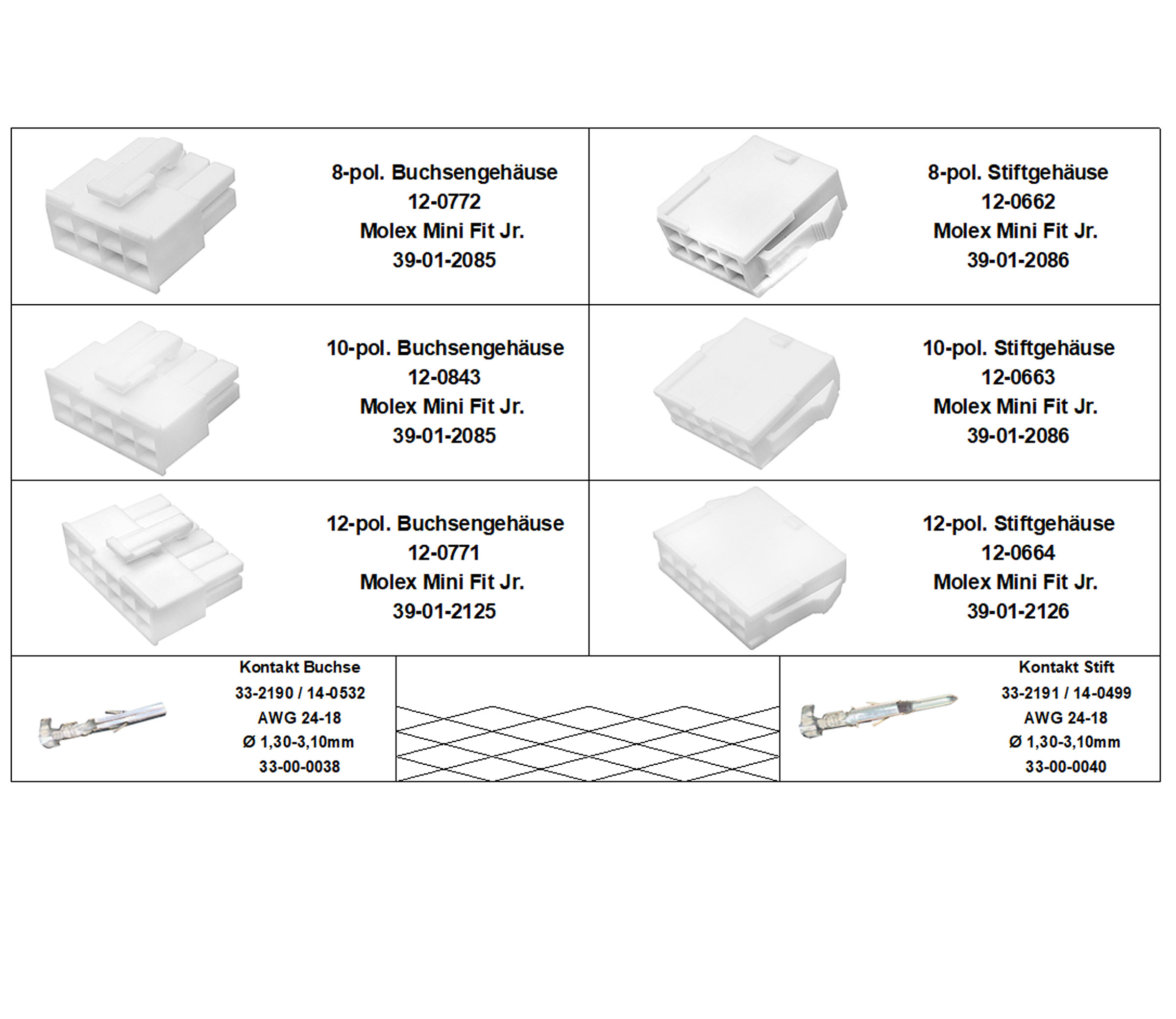 Geliefert wird ein praktisches Sortiment / Set der Serie Molex Mini-Fit Jr. bestehend aus 8-poligen, 10-poligen, 12-poligen Stecker/Steckverbinder und passenden Kontakten für Leitungen AGW 24 - AWG 18 mit einem Außendurchmesser von Ø 1,30-3,10mm.