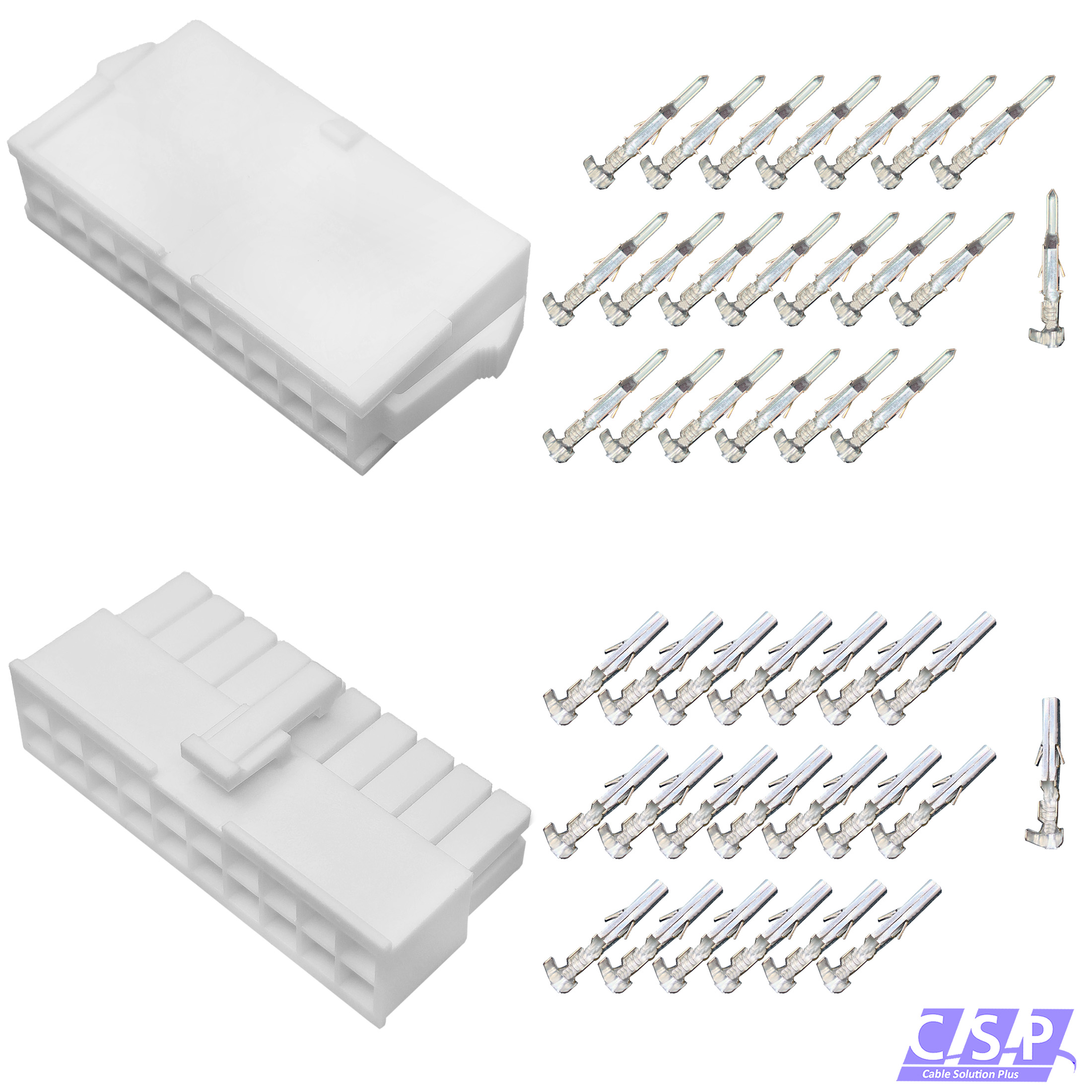 Geliefert wird ein 20-poliges Set aus der Serie Molex Mini-Fit Jr. bestehend aus Buchsen- und Stiftgehäuse mit passenden Buchsen- und Stiftkontakten incl. je 1x Reservecrimp für Querschnitt AWG18-24 und Leitung mit einem Außendurchmesser von Ø 1,30-3,10mm