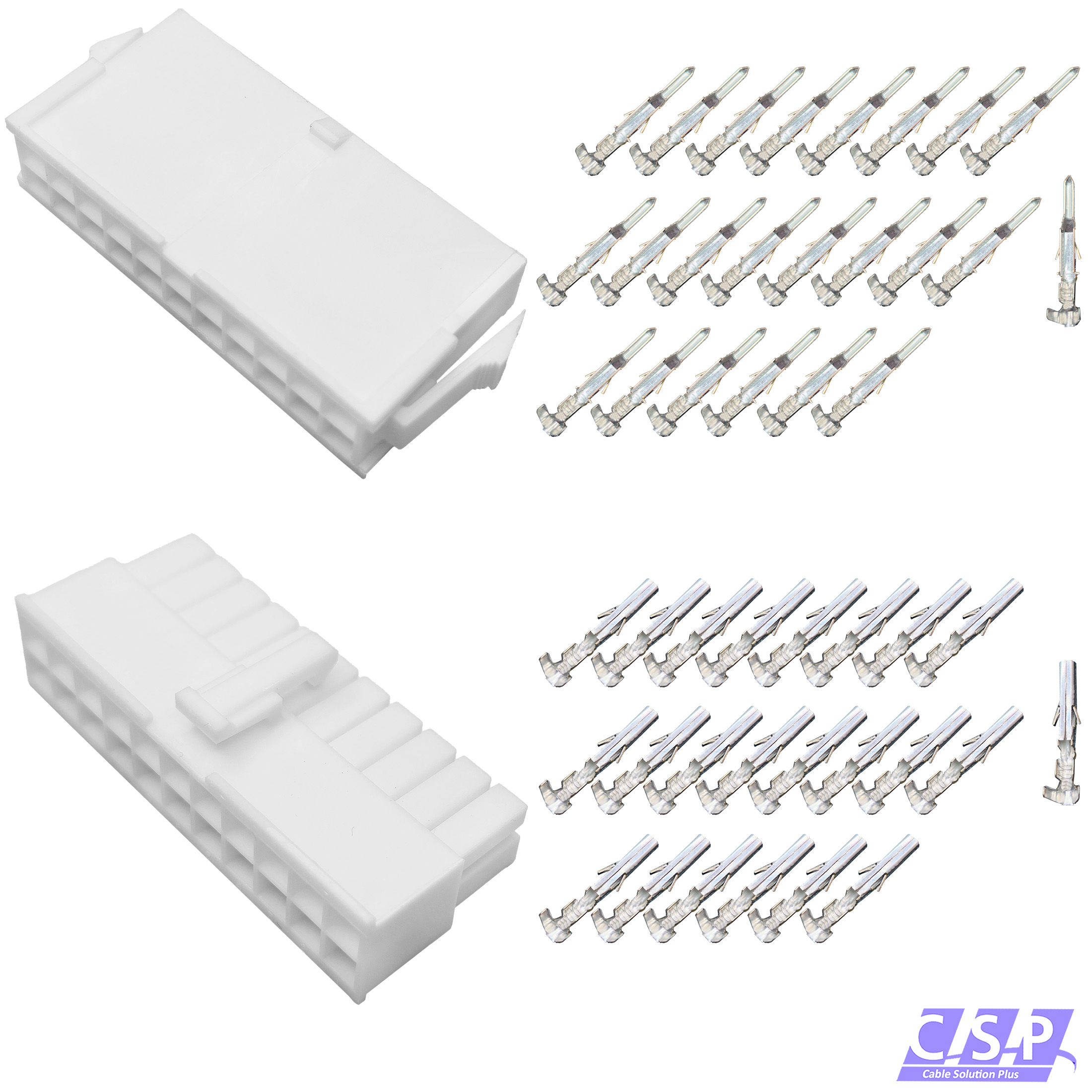 Geliefert wird ein 22-poliges Set aus der Serie Molex Mini-Fit Jr. bestehend aus Buchsen- und Stiftgehäuse mit passenden Buchsen- und Stiftkontakten incl. je 1x Reservecrimp für Querschnitt AWG18-24 und Leitung mit einem Außendurchmesser von Ø 1,30-3,10mm